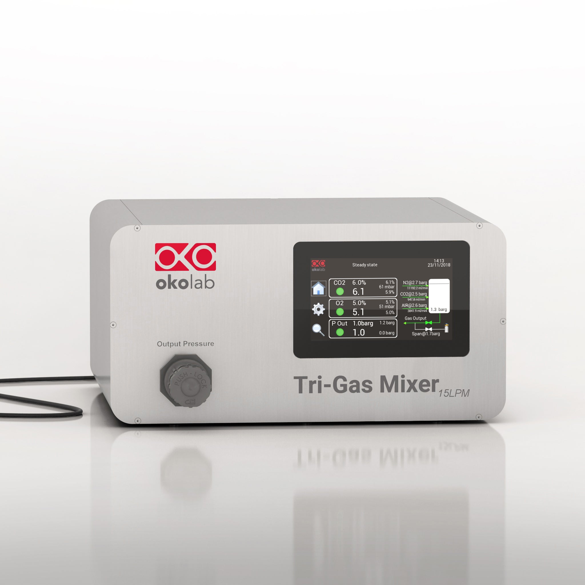 Requited input gasses: Pure gas cylinders of CO2, N2 and Air (or air compressor, which can optionally be purchased from Okolab), at 5 Bar